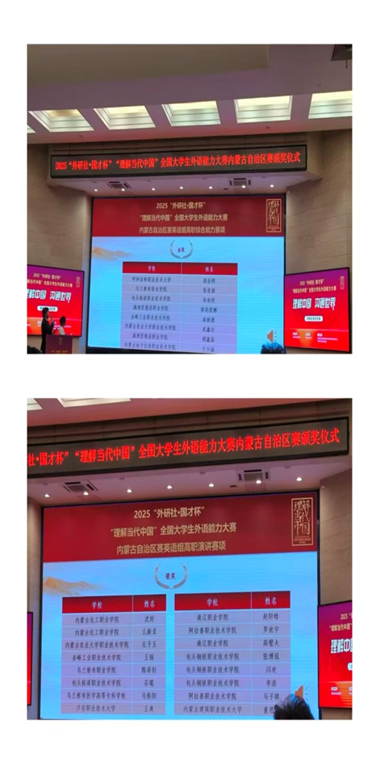 2025年11月1日,由内蒙古自治区教育厅主办的2025年“外研社·国才杯”“理解当代中国”全国大学生外语能力大赛内蒙古自治区赛在内蒙古工业大学成功举办。在综合能力教学部刘丽霞、苏日娜、王亚娜老师的精心指导和带领下,选派参赛的六名学子在英语组高职综合能力大赛与演讲大赛两个赛项中均发挥出色,从全区众多高校的佼佼者中脱颖而出取得了骄人战绩,为学院赢得了崇高荣誉!