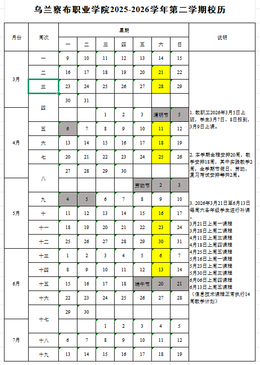 乌兰察布职业学院2025-2026学年第二学期校历